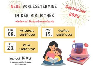 Nach der Sommerpause kehren ab September die beliebten Vorlesestunden für Kinder in die Stadtbibliothek Kölleda zurück. Alle kleinen Bücherfreunde im Alter von 2 bis 10 Jahren sind herzlich eingeladen, spannenden, lustigen und fantasievollen Geschichten zu lauschen.