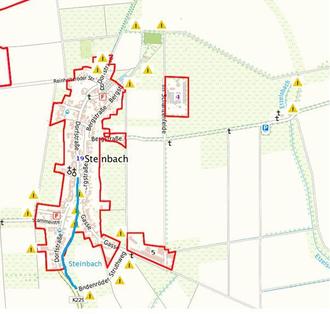 Übersichtskarte Ortslage Steinbach ("!" Gefahrenstellen bei Starkregen und Hochwasser)