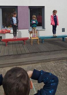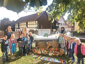 Am Sonntag, den 01.10.2023 gestalteten 16 Kinder unseres Kindergartens bei herrlichem Wetter einen schönen Erntedankgottesdienst auf dem Anger in Siemerode mit.