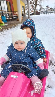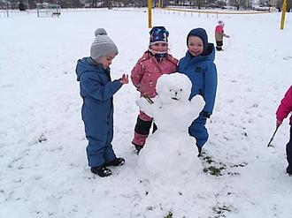 Gleich nach dem Frühstück zogen wir uns warm an und liefen in den Schnee. Dort wurden fleißig große und kleine Schneemänner gebaut, Schneeengel gestaltet, Schneebälle geworfen und sogar auf einer Mini Rodelbahn Schlitten gefahren.