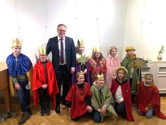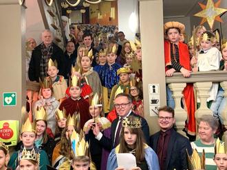 Gemeinsam mit etwa 100 weiteren Sternsingern aus Thüringen, insbesondere aus den Pfarreien in Erfurt, Jena, Arenshausen und Lengenfeld unterm Stein, warteten die Kinder dort gespannt im imposanten Treppenhaus auf den Ministerpräsidenten.