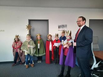 Nun war es an der Zeit den Segen zu überbringen und Dr. König geleitete die Sternsinger zum Hochhaus des Landtagsgebäudes, in dem sich sein Büro befindet. Nachdem zunächst alle den Blick vom Hochhaus über Erfurt und besonders über die naheliegende „Gunda-Niemann-Stirnemann-Halle“ haben schweifen lassen, versammelten sich die Sternsinger gemeinsam mit einigen Mitgliedern der CDU-Fraktion im Büro des Landtagspräsidenten, um auch hier mit geübten Vorträgen von Viktoria, Noah, Amelie, Melina und Linda und dem Singen der Lieder dann den Segen zu überbringen.