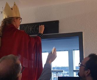 Die Spende wurde gleich in der von Janis transportierten und verplombten Spendendose verstaut und auf einer Schiefertafel über der Bürotür des Landtagspräsidenten wurde sogleich von Linda der Segensspruch „20*C+M+B+25“ mit Kreide angeschrieben, was bedeutet: christus mansionem benedicat - Christus segne dieses Haus.