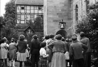 1961 werden zwei neue Glocken auf den Kirchturm gebracht. Das Bild zeigt die kleine Glocke samt dem gekröpften Stahl-Glockenjoch.