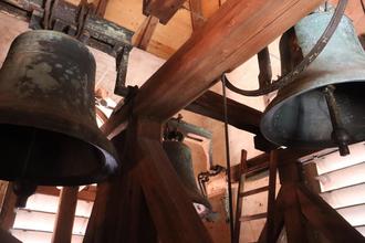 Die drei Glocken im Steinbächer Kirchturm, links die Mauritiusglocke, rechts die kleine Michaelglocke und in der Mitte die Angelus-Glocke, die von Pfarrer Meinolf Jünemann gestiftet wurde. Foto: P. Anhalt.