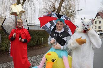Trotz des schlechten Wetters und Nieselregen ließen sich die Steinbächer Narren nicht abhalten, durch das Dorf zu ziehen und nach alter Tradition Würste einzusammeln. Der Tanzbär hatte allerdings ein weißes Fell. Dennoch wurde großzügig gespendet.