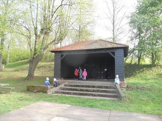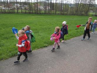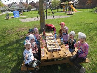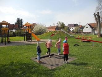 Dann gingen wir weiter "Unter die Eiche"! Dort konnten wir spielen und die Natur genießen. Bald klangen schon die Stimmen der Sonnenscheinkinder zu uns herüber. Wir setzten unseren Spaziergang durch Westhausen fort und kamen schließlich auf den tollen Spielplatz. Die Kinder und Erzieherinnen vom Kindergarten Sonnenschein freuten sich über unseren Besuch und unserer Kinder knüpften erste Freundschaften. Dann durften wir uns sogar den Kindergarten anschauen.