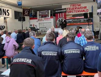 Begonnen wurde der Vormittag mit einer evangelischen Messe direkt im Gerätehaus. Pfarrer Frank Himmelmann ging in seiner Predigt auf das Wirken der Feuerwehr innerhalb der letzten 90 Jahre ein, betrachtete aber auch die Zeit davor. Unter einem aufgespannten Schirm in Regenbogenfarben predigen, schlug er die Brücke zur Funktion des Schirmes und zur Feuerwehr im Ort und darüber hinaus. Wie schnell kann man einen Schirm vergessen, wenn er gerade nicht benötigt wird und wie froh ist man, wenn man ihn braucht und einen zur Hand hat. Auch wie ein Schutzschirm für ihren Heimatort wirkt die Feuerwehr allein durch die Tatsache, dass es diese gibt.