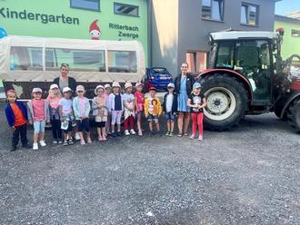 Pünktlich um 09.00 Uhr holte uns Julian Gunkel mit dem Kremserwagen vom Kindergarten ab. Mit Musik und Gesang starteten wir in unseren Tag. Erster Stopp war bei ein Besuch Julians Kühen. Diese dürfen wir wieder füttern und streicheln. Unser Ziel war das „weiße Häuschen“ im Wald (Herrschaftsweg). Nach einer kurzen Trinkpause wurden wir von Förster Thomas herzlich begrüßt. Mit ihm gingen wir in den Wald und er erklärte uns den Unterschied zwischen Laub- und Nadelbäumen und vieles mehr. Gemeinsam haben wir ein großes Bodenbild gelegt. Nach den vielen Informationen stärkten wir uns und erkundeten den Wald.