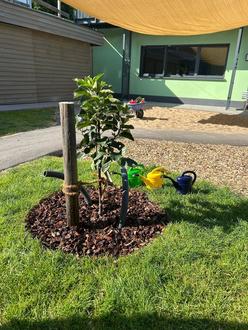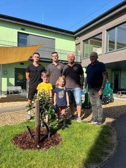Mit freundlicher Genehmigung des Bürgermeisters und der Kindergartenleitung sowie tatkräftiger Unterstützung durch 2 „Ritterbachzwerge“ pflanzten wir am 21.08.2025 einen Apfelbaum auf dem Hof des Kindergartens Wingerode.
