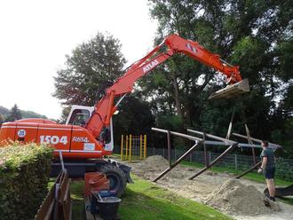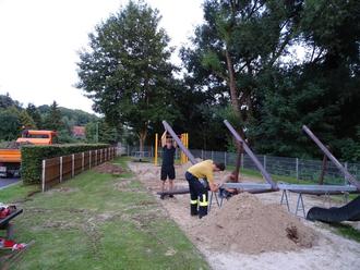 Die für die Fundamente notwendigen Löcher wurden durch Martin Schmidt ausgehoben. Das Zusammenbauen der Schaukel erfolgte gleich im Anschluss. Hierbei halfen Luis Deppe und Anton Vieth von der Jugendfeuerwehr tatkräftig mit. Durch die Unterstützung von Mathias Kaiser konnte die Schaukel dann mittels Bagger genau ausgerichtet und aufgestellt werden. Nachdem durch die Bauhofmitarbeiter der Beton für die Fundamente eingebaut wurde, konnte die Schaukel pünktlich zum Sportfest ihrer Bestimmung übergeben werden.