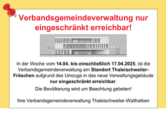 In der Woche vom 14.04. bis einschließlich 17.04.2025, ist die Verbandsgemeindeverwaltung am Standort Thaleischweiler-Fröschen aufgrund des Umzugs in das neue Verwaltungsgebäude nur eingeschränkt erreichbar.