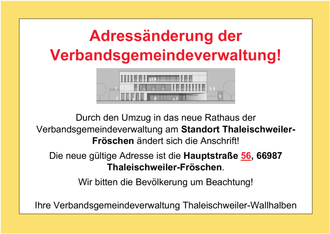 Durch den Umzug in das neue Rathaus der Verbandsgemeindeverwaltung am Standort Thaleischweiler-Fröschen ändert sich die Anschrift!