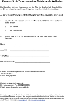 Die Verbandsgemeinde Thaleischweiler-Wallhalben und die Agentur Landmobil entwickeln in den nächsten Monaten einen Bürgerbus. Alle Bürgerbusse werden immer individuell auf den lokalen Bedarf hin entwickelt. Verbandsgemeinderat und die Ortsgemeinden haben dem Bürgerbusprojekt das Mandat erteilt. Weitere Informationen: www.vgtw.de und www.buergerbus-rlp.de