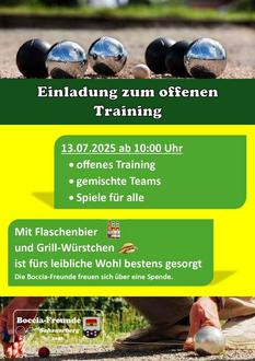 Die Boccia-Freunde laden alle Interessenten, Freunde und Gönner ein zum „Offenen Training“ am 13.07.2025 ab 10:00 Uhr auf dem Bolzplatz. (hinterm Friedhof)