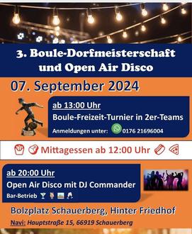 Samstag: Boule Turnier am Sportplatz mit Frühschoppen, Mittagessen Open Air Musik mit DJ Commander ab 20 Uhr