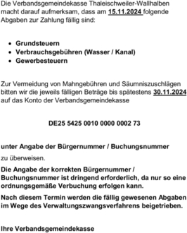 Die Verbandsgemeindekasse Thaleischweiler-Wallhalben macht darauf aufmerksam, dass am 15.11.2024 folgende Abgaben zur Zahlung fällig sind: