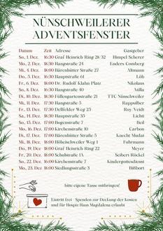 der große Zuspruch zur Premiere unserer diesjährigen Adventsfensteraktion erfreut mich sehr und zeugt von unserer lebendigen Dorfgemeinschaft. Ich bedanke mich bereits im Vorfeld bei allen Gastgebern sehr herzlich, die ein Fenster präsentieren und den damit verbundenen Aufwand nicht scheuen.