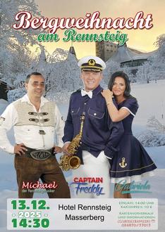 | Sa. 13.12.2025, 14:30 Uhr | Schlagernachmittag mit Captain Freddy, Gabriela und Michael dem Rennsteigmusiker Veranstaltungsort: Hotel Rennsteig Masserberg VA: Gemeinde Masserberg Kartenvorverkauf in der Masserberg Information |