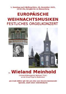 In einer festlichen Orgelmusik an der historischen Orgeln der evang. Bergkirche in Masserberg (Thür. Wald) wird Dr. Wieland Meinhold (Weimarer Universitätsorganist) am Sonntag, dem 28. Dezember 2025, um 14:30 Uhr berühmte Werke des barocken Europa zu Gehör bringen. Aber weihnachtliche Musik beinhaltet noch mehr: Von der vitalen Hirtenfreude künden die französischen Noëls, die italienischen und böhmischen Pastoralen auf der Orgel oder die wundervollen Variationen "Aria variata pastoralis" von Franz Xaver Murschhauser für Orgel.