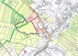 Lageplan mit Geltungsbereich (dick schwarz gestrichelt in der Mitte grün) des vorhabenbezogenen Bebauungsplan „Auf dem Hügel 2" der Gemeinde Masserberg (Kartengrundlage „Geoportal Thüringen ©; ohne Maßstab) Die gleichfalls schwarz-weiß umrandeten hellroten Flächen sind die vorhandenen und umgesetzten angrenzenden Bebauungspläne.