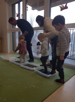 Anschließend konnten die Kinder mit ihren Eltern und Geschwistern an den verschiedenen Stationen ihre Schnelligkeit, Geschicklichkeit und andere Talente unter Beweis stellen. In der unteren Etage gab es Schneeballzielwurf und einen Wettlauf mit selbstgebastelten Skiern. Oben wurde gemalt und gebastelt, Schneeballwettlauf, Barfußweg und Tombola durften auch nicht fehlen. Neben dem Barfußweg wurde ein kleiner Info-Stand über unser zukünftiges Vorhaben „Kneippen“ vorgestellt.