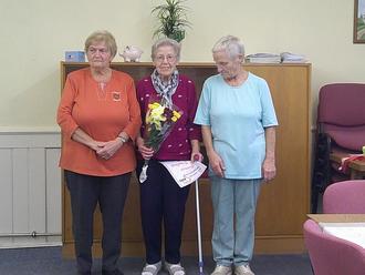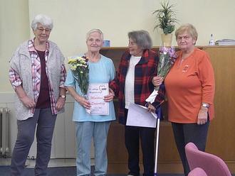 Es ist bei uns üblich, langjährige Mitgliedschaft mit Urkunde und Blumen zu ehren. So baten wir diesmal Martina Sauerteig und Gertraude Fischer für ihre 10-jährige, sowie Gertrud Deyßing für 30-jährige Treue nach vorn. Christel Badura ist uns trotz ihrer Behinderung ebenfall seit 30 Jahren verbunden. Ihr wird zu Hause dafür gedankt. Gustel Donath erhält nach hoffentlich erfolgreichem Krankenhausaufenthalt die Ehrung für 25 Jahre.