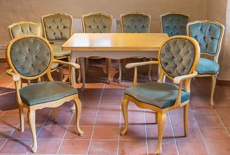 Es handelt sich um 8 Polsterstühle, 1 Vitrinenaufsatz, 2 Vitrinen mit Unterschrank, 1 großer Unterschrank und 1 Tisch.