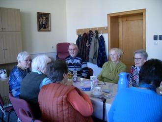 Dann griffen beim Kaffeetrinken alle kräftig zu. Die Krapfen mit viel richtiger Hiftenmarmelade von Ronny gebacken und von Steffi pünktlich geliefert sahen gar zu verlockend aus und schmeckten richtig lecker! Jetzt konnten auch endlich in Ruhe die Neuigkeiten aus Familie und Umwelt ausgetauscht werden. Schließlich treffen wir uns nur einmal im Monat und da gibt es doch so allerhand zu bereden. Endlich war auch der letzte Hunger gestillt, der Kaffeedurst gelöscht und Liesel stand schon mit ihrer Spaßzettelmappe bereit. Kurze und auch längere Gedichte und Geschichten aus alter und neuer Zeit fanden dankbar schmunzelnde und öfter sogar lauthals lachende Zuhörer. Dieses freudige Beieinandersein tut gut und ist besonders wichtig in dieser oft schwierigen Zeit. Das Eierlikörchen zwischendurch wurde natürlich auch von niemandem abgelehnt. Auf die Spendenfreundlichkeit unserer Mitglieder kann man sich eben verlassen. Zum Abschluss gabs noch zwei Wiener als Kraftspender für den Heimweg.