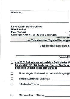 Interessierte Vereine und Akteure aus Tourismus, Handwerk und Kulinarik können sich jeweils eigenständig unter Nutzung des beigefügten Rückmeldebogens der Interessenbekundung beim Wartburgkreis anmelden.