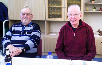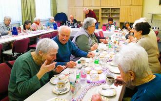 Der Vorstand hatte für Augen, Mund und Ohren der Gäste wie immer alles liebevoll vorbereitet. Kaffee duftete und lockte mit den Krapfen auf den bunt dekorierten Tischen um die Wette. Da ließ sich niemand lange bitten und bald gab`s die eine oder andere Zuckerschnute zu belachen. Herrgott, senn die Dinger gut! Dou passt dach wengstens a halbe noch nei, aa wenn me echentlich schöö sout is. Der Bauch ist zufrieden. Nun fordern die Ohren nach Späßen aller Art.