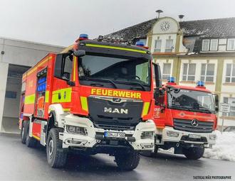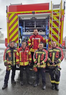 Andrerseits haben wir in der Feuerwehr Frankenblick große Verantwortung übernommen. Ich werde nicht müde, zu erwähnen, dass unsere Kameradinnen und Kameraden der Feuerwehr freiwilligen Dienst tun und ein sehr verantwortungsvolles und zeitaufwändiges „Hobby“ ausüben. Ich bedanke mich an dieser Stelle bei Allen, die dazu beitragen, dass wir von uns behaupten können, im Brand- und Katastrophenfall gut vorbereitet zu sein, also sowohl bei den Akteuren vor Ort als auch bei den zuständigen Mitarbeitern des Landkreises Sonneberg. Diese ließen es sich dann auch nicht nehmen, das „GTLF“ auf seiner Fahrt vom Abholort Nobitz im Altenburger Land zum Stationierungsort Frankenblick am 28.01.2026 zu begleiten. (neben unseren Kameraden auf dem Foto mit abgebildet: Kreisbrandinspektor Mathias Nüchterlein und sein Stellvertreter KBM Florian Eichhorn)