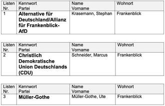 Der Wahlausschuss der Gemeinde Frankenblick hat in seiner Sitzung am 08.04.2025 folgende Wahlvorschläge für die Wahl des Bürgermeisters/der Bürgermeisterin der Gemeinde Frankenblick am 11.05.2025 als gültig zugelassen, die hiermit bekannt gegeben werden.