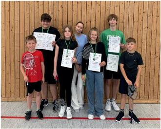 Spieler des TSV 1864 bei den diesjährigen Südthüringer Bezirksmeisterschaften im Badminton: v.l. Finley-Noah Hopf, Lion Schliewe, Emma Sasse, Mia Krasznek, Emely Armborst, Timo Ksionzek, Arthur Stellmacher (es fehlt Antonia Walter)