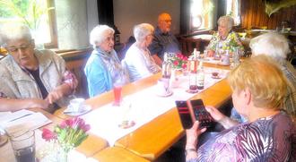 Anmeldung und Mitfahrmöglichkeit für alle „Reisewilligen“ des AWO-Treff Effelder bei Anette, Dieter S. und Ursula hat sie abgesichert. Anettes Auto mit „Inhalt“ ist schon unterwegs, als Dieter pünktlich am Marktplatz hält. Danke und nochmal Entschuldigung für unseren „Frühstart“, Dieter! Me wollt‘n aam die Erscht’n sei! Die Wirtin empfängt uns freundlich. Sie zeigt starke Nerven bei der ersten Bestellung - Wasser mit und ganz ohne Gas, welchen Saft bei der großen Auswahl? Kännchen oder Tasse Kaffee, das ist die Frage! Ach so, Latte geht auch? Romy schafft es jeden Wunsch zu erfüllen. Der Kuchen schmeckt - alle sind erstmal zufrieden!