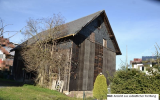 | Objektbeschreibung: Bei der Bebauung handelt es sich um eine eingeschossige Scheune mit Heuboden aus dem Jahr 1900. Das Gebäude ist freistehend und nicht unterkellert. Es ist mit einer Holzschalung (Nadelholz) mit Resten einer ehemaligen Naturschieferverkleidung am Giebel eingefasst. Das Satteldach ist mit Dachziegeln aus Ton eingedeckt. Das gesamte Gebäude weist umfangreiche altersbedingte Schäden auf, insbesondere am Dach und der Fassade. Die Bauschäden sind im Ansatz der Restnutzungsdauer von 5 Jahren berücksichtigt. | |