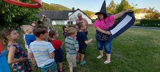 Dann kam der erste Höhepunkt des Abends. Eine Hexe tauchte plötzlich auf und bereitete alles vor, damit sich die kleinen Zuckertüten am Zuckertütenbaum über Nacht in große und reichlich gefüllte verwandeln. Dazu musste ein Zaubertrank gebraut werden. Die Kids füllten nach und nach Zutaten, wie Drachenblut, Froscheier, Sonnenstaub und allerlei Geheimes in den Eimer. Das Zusammenbrauen wurde von einem magischen Spruch begleitet. Jeder musste den Trank dann rühren, damit es funktioniert. Zum Schluss wurde der Baum damit gegossen.