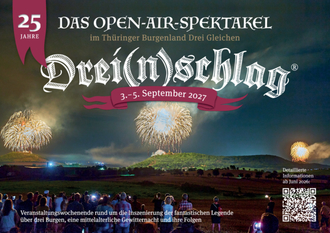 Die Legende vom gleichzeitigen Blitzeinschlag in die drei Gleichen-Burgen im Mai 1231 stammt aus dem unerschöpflichen Füllhorn der thüringischen Märchen- und Sagenwelt. Eingedenk, dass sich in dieser Welt auch immer ein Quäntchen Wahrheit verstecken könnte, wurde 2002 mit dem DREI(N)SCHLAG® diese Legende aus dem 13. ins 21. Jahrhundert katapultiert. Und da die Blitz-Legende im Jahr 2031 auf ihren 800. Geburtstag zurückblicken kann, haben sich die Veranstalter des Open-Air Spektakels für zwei vierjährige Pausen entschlossen, so dass nach 2023 und 2027 der große Geburtstags- DREI(N)SCHLAG® im Spätsommer 2031 begangen werden kann. Hinter dem Namen DREI(N)SCHLAG® (seit 2001 als Wortmarke urheberrechtlich geschützt) verbirgt sich die Inszenierung eben jener Legende vom Blitzeinschlag in die Burg Gleichen, die Mühlburg und die Veste Wachsenburg. In einer fulminanten Pyro-Show werden die drei Burgen erneut zu drei riesigen Fackeln, die den Landstrich zwischen Gotha, Erfurt und Arnstadt in den grellen Farben des Feuers erleuchten.