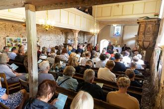 Bei dem Sonntagsgottesdienst am Vormittag scheint stets das Sonnenlicht durch das historische Buntglasfenster mit der Lutherrose hinter dem Altar und taucht den Innenraum in die traditionellen Farben Rot, Blau und Gold.