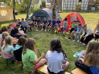 Unser erstes Sommerferienangebot war ein toller Auftakt. Am Freitag, nach der Zeugnisausgabe, ging es mit dem Zeltcamp in Pferdingsleben mit 34 Kindern aus der VG „Nesseaue“ und der Gemeinde Drei Gleichen los. Die Kinder erlebten sehr viel in den vier Camp-Tagen. Es gab reichlich Aktionen z. B. Göffel (Gabel/Löffel) schnitzen, Knotenkunde, Flöße bauen, Nachtwanderung, welche die Kinder begeisterten. Ein Highlight war die Wasserschlacht bei den sehr hohen Temperaturen. Dies schaffte für alle Teilnehmer eine Abkühlung bzw. Erfrischung.