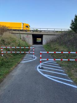Um insbesondere ortsfremden Verkehrsteilnehmern rechtzeitig auf die Durchfahrtsbeschränkung (Umlaufsperren) an der Autobahnunterführung Richtung Mühlberg aufmerksam zu machen, war die Aufstellung von Verkehrszeichen (VZ 357-50) notwendig.