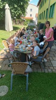Die Herstellung von Betonuntersetzern mit Mosaikfliesen stellte eine kreative Heraus-forderung dar. Hier konnten die Kids ihrer Fantasie freien Lauf lassen und individuelle Designs kreieren. Das Arbeiten mit Beton erforderte Präzision und Sorgfalt, was den Teamgeist stärkte und den Teilnehmern ermöglichte, stolz auf ihre einzigartigen Kunstwerke zu sein. Ein weiterer Höhepunkt der Woche war die Wanderung zum Hotel Wandersleben. Im Hotel angekommen, begrüßte uns die Geschäftsführerin, Maria Scheffel mit einer Aufgabe. Diese beinhaltete das Verjagen der Räuber, die sich im Hotel befanden und sich die Bäuche vollschlugen. Durch das richtige lösen von Quizaufgaben rund um die Märchenwelt öffnete uns eine Hexe die Tür und wir durften ins Hotel eintreten. Im Räuberkeller angekommen, wo sich zum Glück keine Räuber mehr befanden, bekamen alle Kinder ein kühles Getränk. Danach führten wir im Hotelgarten Märchen auf, wobei Kostüme zum Einsatz kamen. Die Teilnehmer schlüpften in verschiedene Rollen und erweckten bekannte Geschichten zum Leben. Diese Theateraktivität förderte nicht nur das Selbstbewusstsein, sondern auch Teamarbeit und Kreativität.