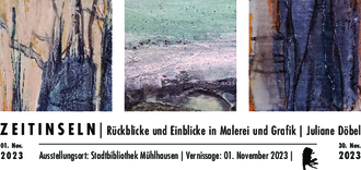 Vom 01.11. - 30.11.2023 findet die Ausstellung „Zeitinseln“ von Juliane Döbel in der Stadtbibliothek statt. Zum Beginn lädt sie herzlich zur Vernissage ein. Mit freundlicher Förderung der Stiftung Westthüringen der VR Bank.