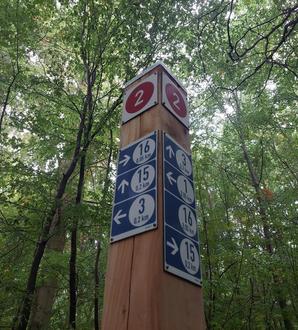 Überall dort, wo sich im Stadtwald Wege kreuzen, wurden Pfosten aus Lärchenholz angebracht - die Knotenpunkte. Jeder hat eine eigene Nummer zwischen 1 und 112 erhalten. Darunter sind die nächstgelegenen Knotenpunkte mit Richtungsangaben und Entfernung aufgeführt. Suchen Sie sich eine Wegstrecke aus und merken oder notieren Sie sich die entsprechenden Nummern. Auch das Smartphone können Sie dafür nutzen.