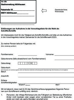 Grundlage für die im September/Oktober 2023 stattfindende Schöffenwahl beim Amtsgericht Mühlhausen bildet eine gemeindliche Vorschlagsliste, die vom Stadtrat der Stadt Mühlhausen spätestens bis zum 15. Juni 2023 beschlossen sein soll.