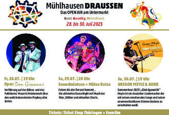 Die Stadt Mühlhausen lädt zum dritten Sommer Open Air. Ein bisschen anders, ein bisschen neu findet „Mühlhausen DRAUSSEN“ in diesem Jahr erstmals in etwas größerem Format auf dem Untermarkt statt. Tolle Gemeinschaftserlebnisse präsentieren wir allen Mühlhäuserinnen und Mühlhäusern sowie Gästen unserer Stadt an diesem sommerlichen Open-Air-Wochenende. An drei aufeinanderfolgenden Abenden können Sie hochkarätige Veranstaltungen genießen und es ist tatsächlich für jeden Geschmack etwas dabei.