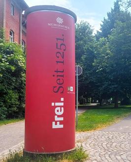 Die ersten Säulen sind bereits frisch beklebt. Im wahrsten Sinne des Wortes plakativ wird hier auf die neue Markenstrategie „Frei. Seit 1251.“ unserer Mittelalterlichen Reichsstadt Mühlhausen hingewiesen. Dass dies etwas mit der langen Geschichte als Reichsstadt zu tun hat, wird bereits an der Jahreszahl deutlich. Aber um welches Ereignis es dabei genau geht und was dieses über die Bedeutung von Zusammenhalt und Gemeinschaft in unserer Stadt aussagt, ist auf der Internetseite https://marke.muehlhausen nachzulesen.