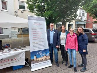 Anlässlich des Jubiläumsjahres „1.050 Jahre Eschwege“ fand in unserer Partnerstadt am Samstag, 15.06.2024 der Tag der Vereine statt. Der Mühlhäuser Partnerstädte e.V. und der Städtepartnerschaftsverein Eschwege haben an diesem Tag ein Zeichen gesetzt. Mit einem gemeinsamen Stand haben sie nicht nur für Mühlhausen, sondern auch für die Verbundenheit zwischen den Städten geworben. Die Besucher hatten die Gelegenheit, in die reiche Geschichte und Kultur Mühlhausens einzutauchen und sich über das bevorstehende Gedenkjahr 2025 mit der Thüringer Landesausstellung „freiheyt 1525 - 500 Jahre Bauernkrieg“ zu informieren.