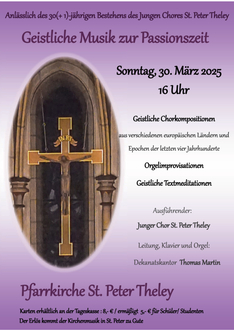 Am Sonntag, 30. März (4. Fastensonntag, Laetare) findet um 16:00 Uhr in der Theleyer Pfarrkirche St. Peter ein Chorkonzert zur Passions - und Osterzeit statt.