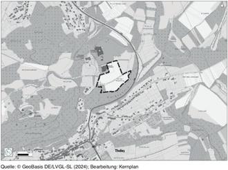 Das Plangebiet befindet sich auf dem Schaumberg an der Gemarkungsgrenze der Ortsteile Theley und Tholey. Es schließt unmittelbar östlich an die Kreuzung der Straßen „Am Schaumberg“ und „Zum Erlebnispark“ sowie südlich bzw. östlich an das Gesundheitszentrum Reha-Fit (Sport- und Rehazentrum) an. Das Erlebnisbad Schaumberg befindet sich ca. 250 m nördlich des Plangebietes. Südlich grenzen bestehende Waldflächen und östlich eine Streuobstwiese an den Geltungsbereich.